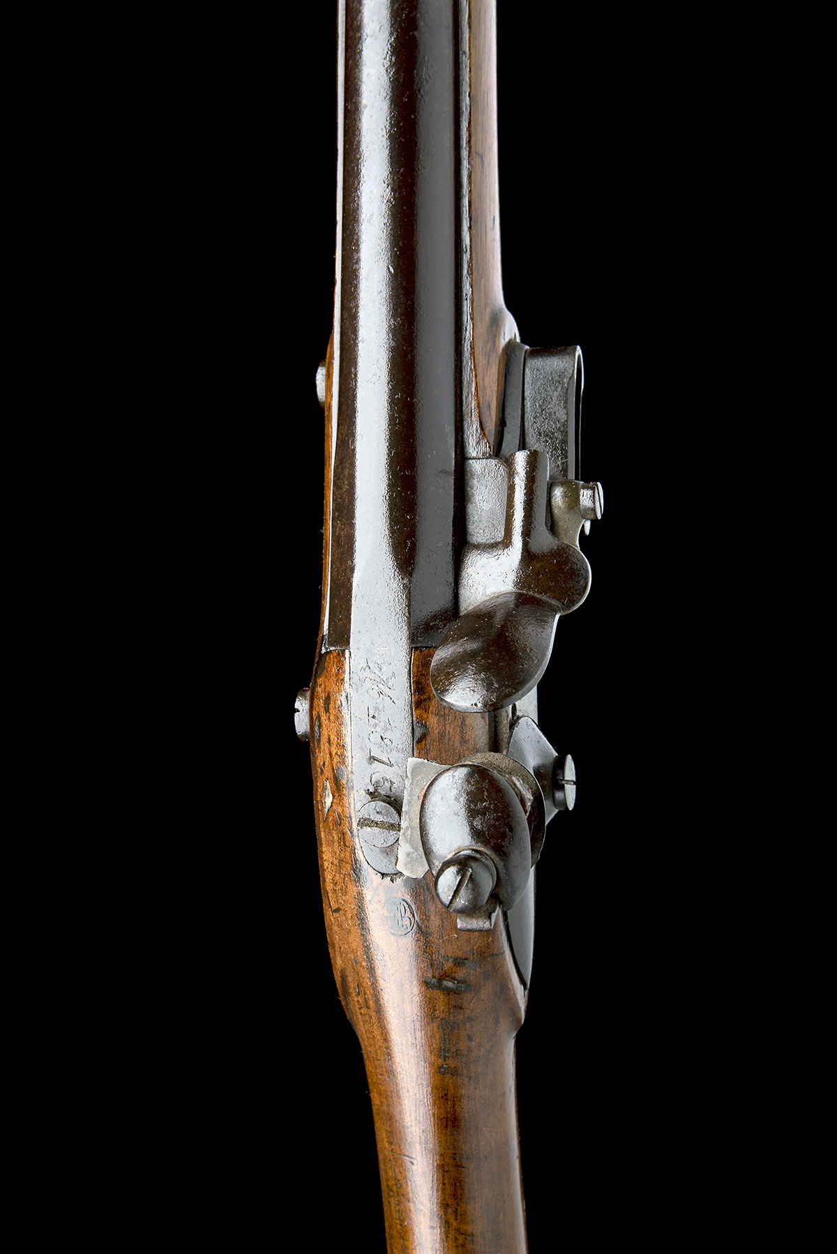 dated for 1819, with blacked 42 3/4in. barrel, model designation to top-tang, plain lock with ring-necked cock, walnut full-stock stamped with a Wallonian crown and date roundel, left side of comb with depression for cheek, iron furniture including two barrel-bands and twin-banded nose-cap, complete with original iron ramrod, 57 1/2in. overall, weight approximately 10 1/4lbs.