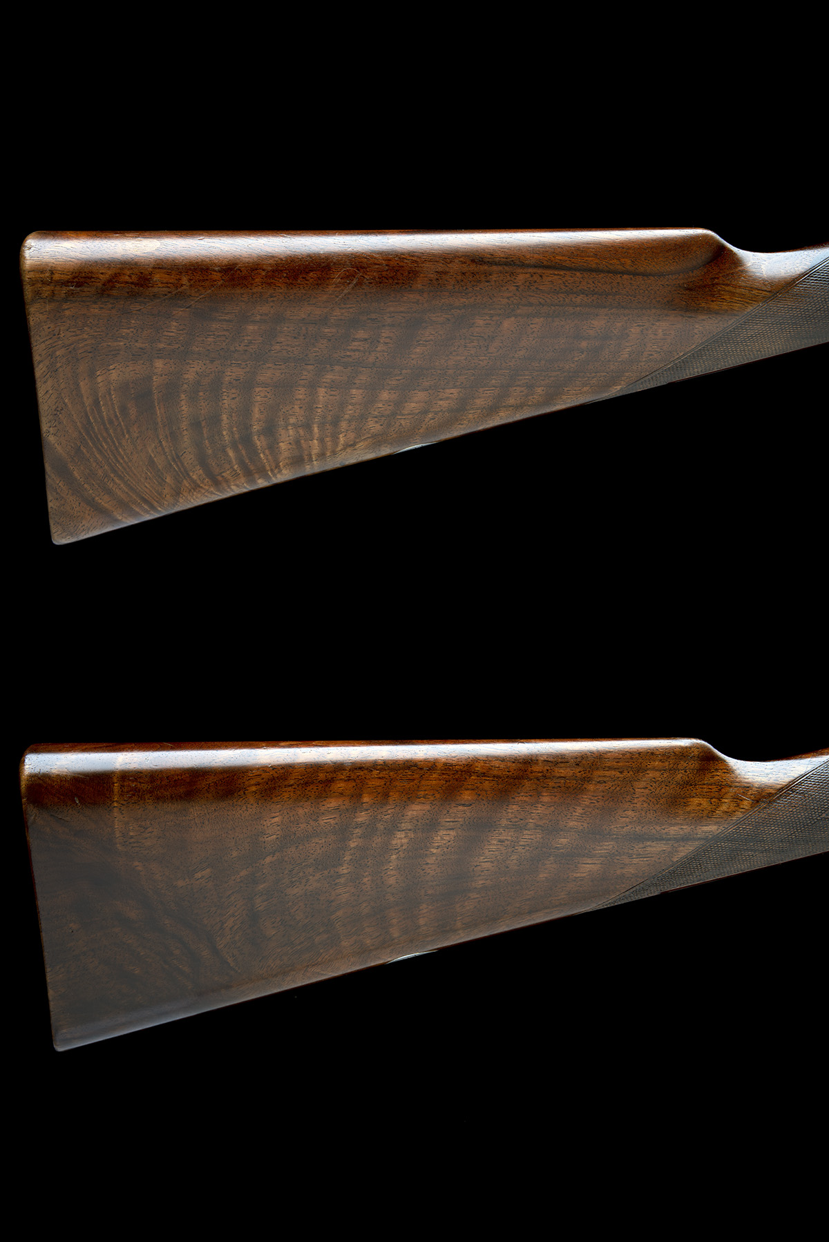 circa 1920, 29in. nitro chopperlump barrels, the ribs engraved 'J. PURDEY & SONS, AUDLEY HOUSE, SOUTH AUDLEY STREET, LONDON. MADE OF SIR JOSEPH WHITWORTH'S FLUID PRESSED STEEL.' and with '1' and '2' at the breech ends, 2 1/2in. chambers, bored approx. true cyl. and 1/2 choke, self-opening actions with removable striker discs, toplevers engraved '1' and '2', automatic safeties with gold-inlaid 'SAFE' details, cocking-indicators, non-selective single triggers, best fine acanthus scroll engraving with floral bouquets, retaining traces of original colour-hardening and finish, 15in. figured stocks (possible replacements), slightly cast on for the left shoulder, weight 6lb. 14oz., in their brass-cornered oak and leather case