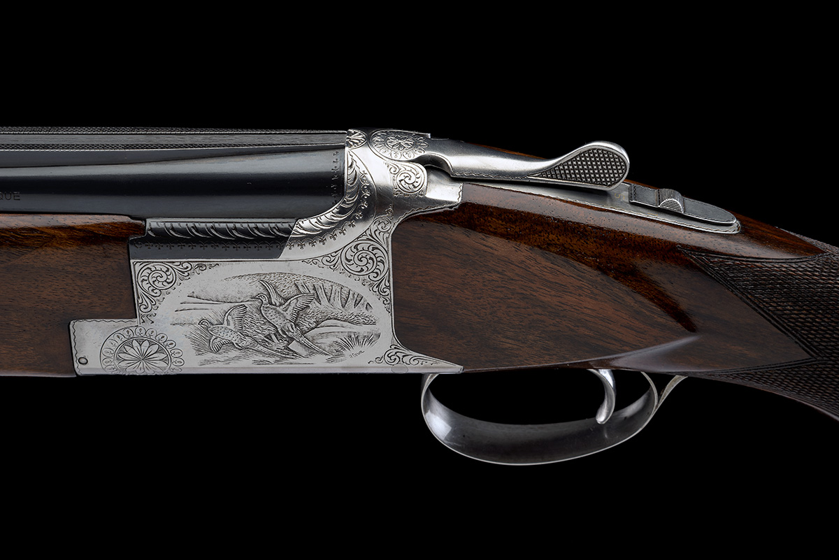 for 1976, 27 1/2in. nitro barrels with 12mm ventilated matt top-rib, 2 3/4in. chambers, bored approx. true cyl. and 1/4 choke, hold-open toplever, automatic safety with integral barrel selector switch, acanthus scroll engraving with game scenes of pheasant and duck, signed 'R. DEWIL', smoothed trigger, bright finish, 14 7/8in. highly-figured replacement pistolgrip stock, weight 7lb. 9oz.