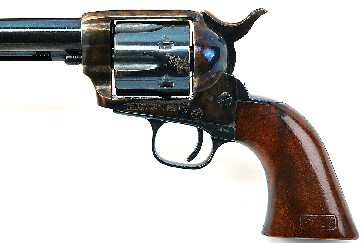 with 3 1/2in. blued barrel of approximately 4mm bore (the maker's signature on the underside removed and blued over), applied blade fore-sight, sighting groove to the top-strap, solid colour hardened frame marked with Colt's patents and dates, blued trigger guard marked ' CAL 45', blued grip-straps and smooth flared walnut grips with impressed martial cartouche on the left side, retaining virtually all its original finish except where noted (light storage marks only), in a later wood box together with a Morgan silver dollar coin dated 1880 (fine condition) and a Colt trademarked keyring triple-bladed turnscrew