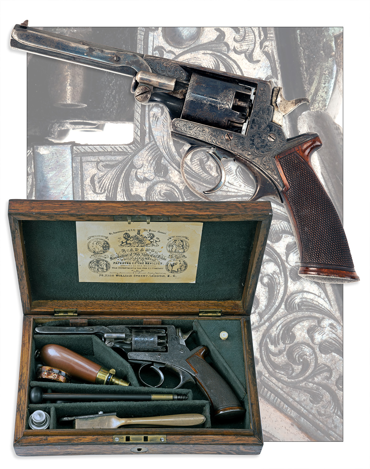 with 4 1/4in. octagonal sighted barrel, engraved band at muzzle, engraved lined borders to barrel flats, and foliate scroll engraving to barrel throat, the top flat signed 'ROBERT ADAMS, 76 KING WILLIAM STREET LONDON' within engraved line borders, profusely scroll engraved frame with lined borders, the right-side engraved in a scrolling banner 'B 11,564 ADAMS PATENT NO 27,227R', the licencing numbers for both the Beaumont and Adams patents, with sliding bolt safety behind the trigger, five shot cylinder with border line engraving around the nipple wells and ribbon band engraving to the front edge, the cylinder centre with panels of foliate decoration, the left-side of the revolver fitted with a Kerr's patent rammer, contained in its associated relined green baize and partitioned oak case, the lid with a replacement Robert Adams, 76 King William St. trade-label, accessories include its double cavity mould, small near mint Dixon flask, cleaning rod, oil bottle and tin of caps, the revolver has a high percentage original deep charcoal blue finish