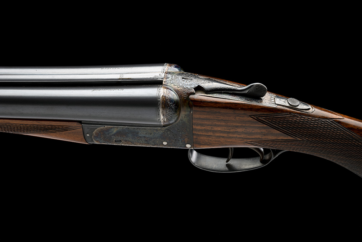for 1963, 30in. nitro barrels (loose on action), the tubes engraved 'WEBLEY & SCOTT. BIRMINGHAM', 2 3/4in. chambers, bored approx. 1/4 choke in both, pinpoint dent left barrel, automatic safety with 'SAFE' detail, border and scroll engraving, retaining much original colour-hardening and finish, 14 1/2in. semi-pistolgrip stock including 3/4in. wooden extension (appears to have been shortened by 3/4in. and then offcut re-attached), weight 6lb. 6oz., in its canvas case