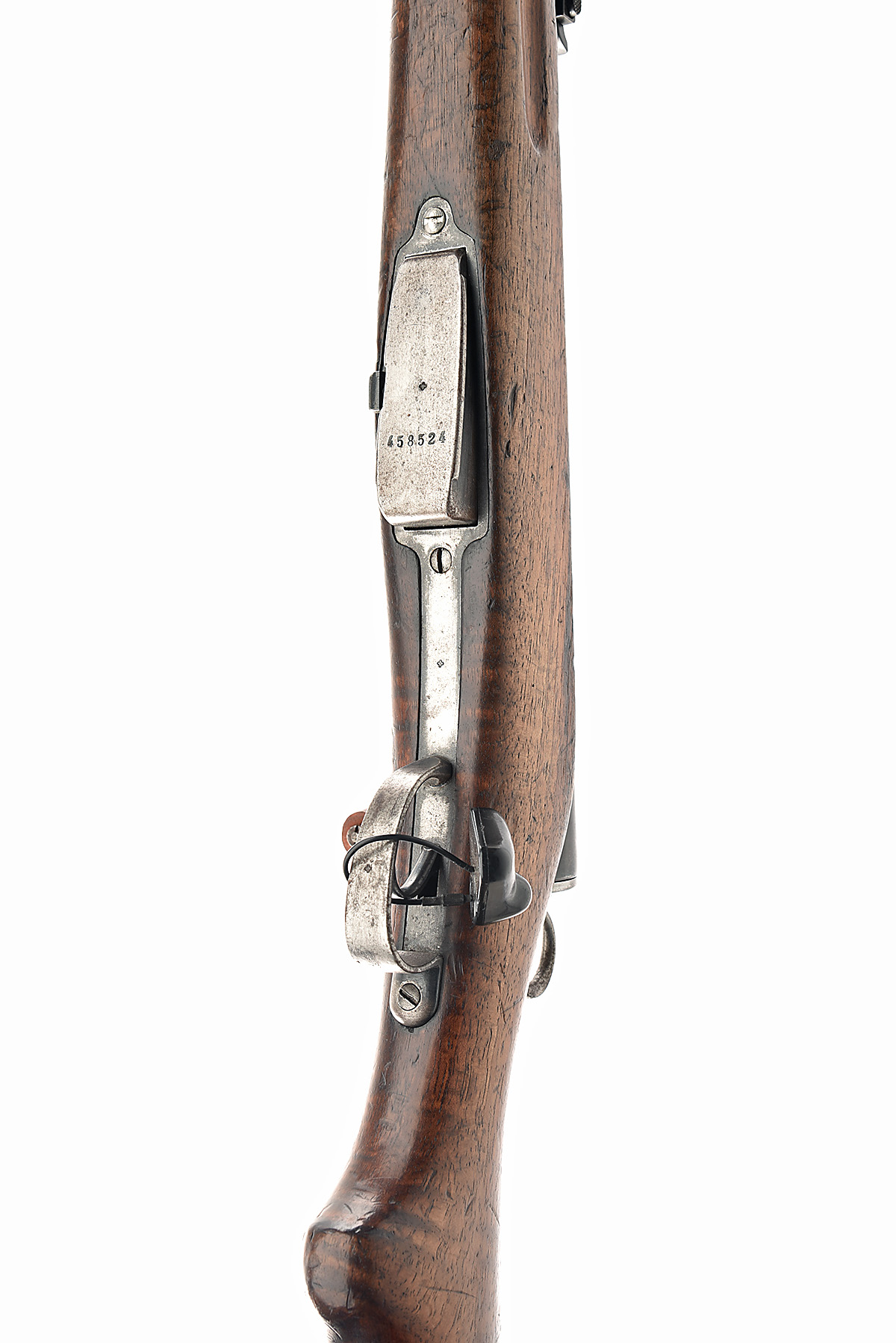 A 7.5X55mm (SWISS) STRAIGHT PULL SCHMIDT-RUBIN BOLT ACTION SERVICE RIFLE MODEL 1889, serial no. 458524, with 31 1/4in. barrel, block and blade front-sight, tangent rear-sight, fluted receiver and straight pull bolt, box magazine, iron mounted full walnut stock, The rifle has a good stock, some minor bruising commensurate with use, barrel and action with much original blue