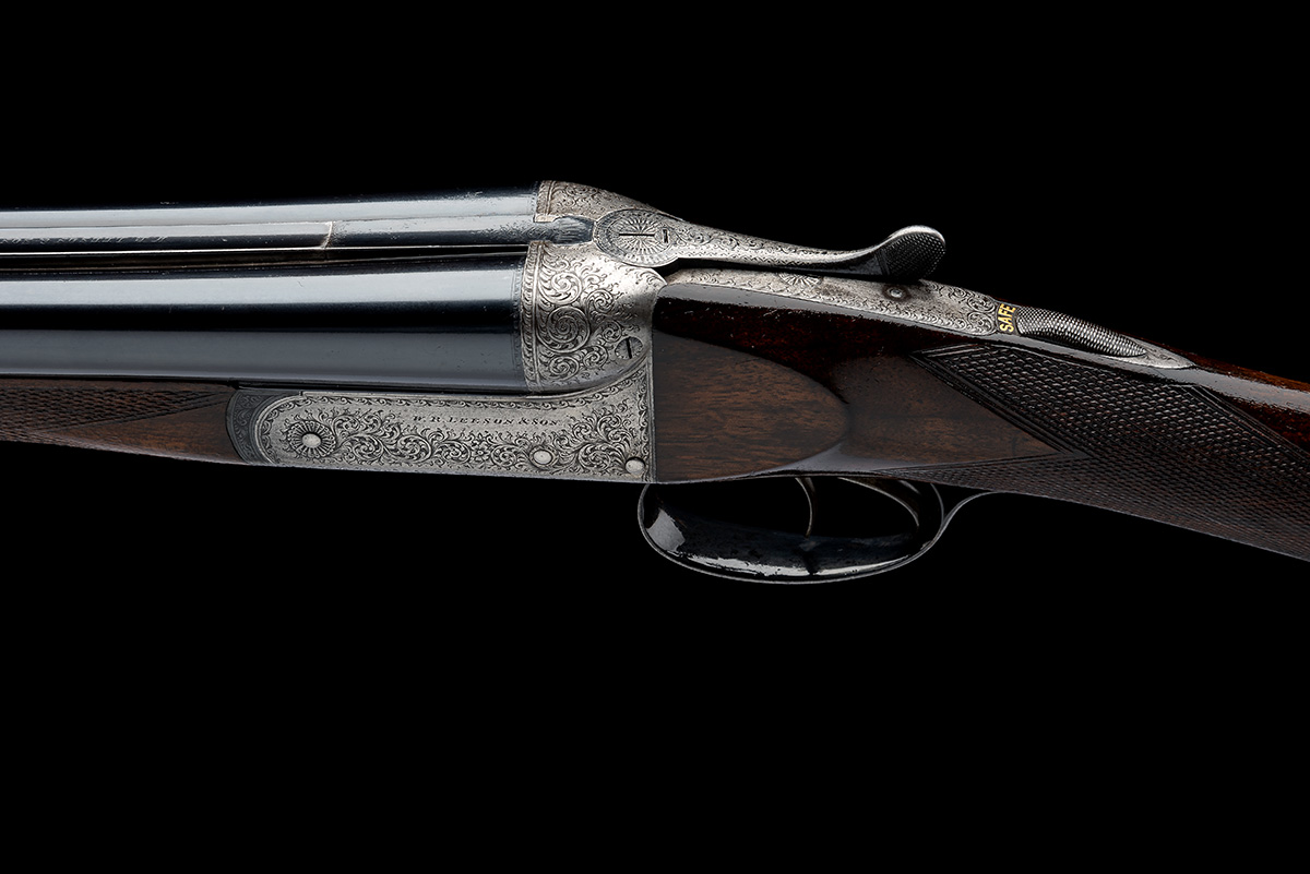 circa 1900, 28in. nitro reproved barrels (in 2023), the rib engraved W. R. LEESON & SON. ASHFORD KENT. & 29 MADDOX STREET. LONDON. W.', 2 3/4in. chambers, bored approx. 1/4 choke in both, some pitting, treble-grip action with removable striker discs, slender toplever, automatic safety with gold-inlaid 'SAFE' detail, intercepting sears, bold acanthus scroll engraving with some feathered bordering, 12 3/4in. stock, weight 5lb. 2oz.