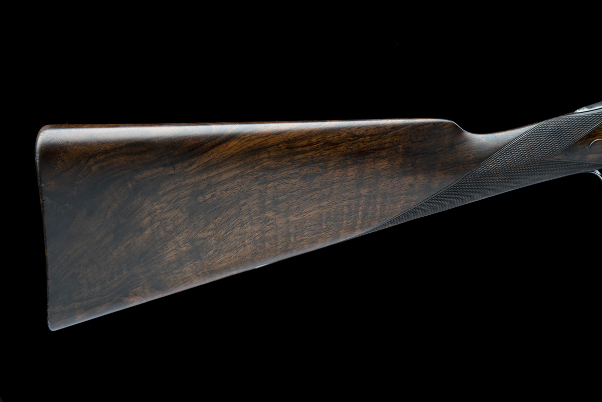 for 1907, 28in. nitro barrels, the rib engraved 'HENRY ATKIN LTD. 41 JERMYN STREET. LONDON.' (faint) and with acanthus scroll detailing at the breech end, 2 1/2in. chambers, bored approx. 1/4 and 1/2 choke, treble-grip action, gas-checks, automatic safety with engraved 'SAFE' detail, gold-lined cocking-indicators, articulated front trigger, border and acanthus scroll engraving, bright and blued finish, 14 1/2in. figured stock, weight 6lb. 7oz., in a leather hammergun case with makers trade label