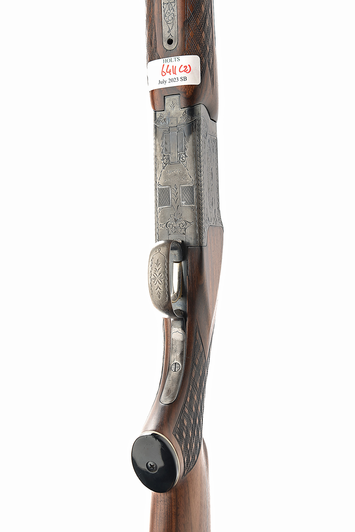 NIKKO 12-BORE 'SHADOW' 12-BORE SINGLE-TRIGGER OVER AND UNDER EJECTOR, serial no. K700214, and one for spares sn. K700774, circa 1978, 27 1/2in. nitro barrels with broad 20mm ventilated matt top-rib, 2 3/4in. chambers, bored approx. true cyl. in both, hold-open toplever, manual safety with integral barrel selector switch, border and acanthus scroll engraving, blacked finish, 13 3/4in. pistolgrip stock including 3/4in. extension;