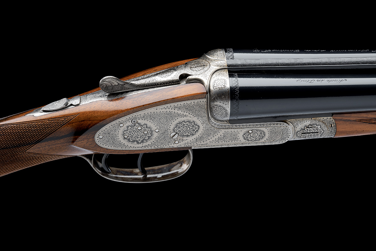 for 1964, 27 1/2in. nitro barrels with raised file cut rib, 2 3/4in. chambers, bored approx. 1/2 and full choke, treble-grip action with hidden third bite, removable striker discs, automatic safety, hand-detachable lockplates with cranked release lever, cocking-indicators, articulated front trigger, fine acanthus scroll engraving with floral bouquets, the triggerplate signed 'INC. ORIZIO. C.', bright finish, 14 1/8in. stock, weight 6lb. 7oz., with its original certificate