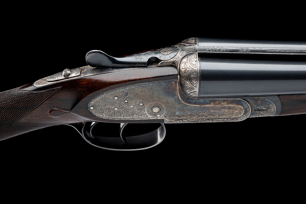 for 1979, 26in. nitro chopperlump barrels, 2 3/4in. chambers, bored approx. true cyl. and 1/4 choke, engraved arcaded fences, removable striker discs, automatic safety, hand-detachable lockplates, gold-inlaid cocking-indicators, articulated front trigger, rolled-edge triggerguard, acanthus scroll engraving, retaining some original colour-hardening and finish, 14 3/4in. stock, weight 6lb. 6oz.