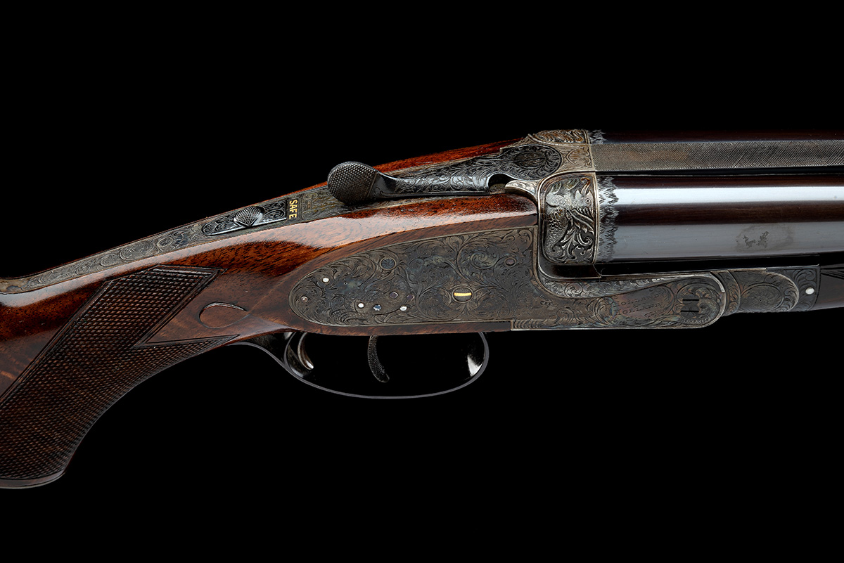 for 1966, 24in. nitro reproved chopperlump barrels with matt sight rib, open sights for 50 and 200 yards with folding leaf sight for 350 yards, matt ramp-mounted bead fore-sight with fold-over protector with integral moonsight, sunken rib engraved '.375 "MAGNUM" FLANGED CTGE.' and gold-inlaid '-SPECIALLY MADE FOR MR Y HARA-', tubes engraved 'HOLLAND & HOLLAND. 13. BRUTON STREET, LONDON.', treble-grip action with side-bolsters and hidden third bite, removable striker discs, elongated top strap with automatic safety and gold-inlaid 'SAFE' detail, hand-detachable lockplates, gold-inlaid cocking-indicators, chequered articulated front trigger, rolled-edge triggerguard, the fences deeply carved in relief with stylised dragons, the action, lockplates and furniture profusely engraved with bold stylised acanthus and foliole motifs interspersed with mythical beasts and serpents, the underside with the Green Man, with the makers name and model designation interwreathed on the action bar, the crosspin with central floral motif encircled 'MADE IN ENGLAND', retaining virtually full original colour-hardening and finish, 14 1/2in. highly-figured pistolgrip stock with cheekpiece and monte carlo comb, steel pistolgrip-cap (with trap) engraved with a further Green Man and retaining virtually full colour-hardened finish, sling swivels, including 1in. leather covered extension and 7/8in. leather covered recoil pad, weight 9lb. 4oz., in its lightweight leather case with accessories and canvas outer
