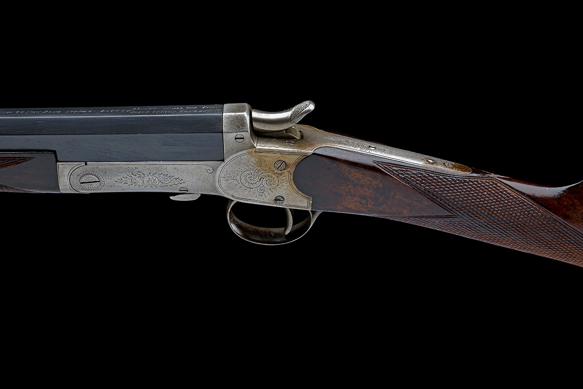 circa 1885, with 24 3/4in. lined barrel (original calibre), open sights with two folding leaf sights, bead fore-sight, the breech end engraved 'SHOT AND REGULATED BY HOLLAND & HOLLAND. 98. NEW BOND STREET. LONDON.' WINNERS AT ALL THE "FIELD" RIFLE TRIALS LONDON 1883', unsigned scoop-backed action, border and acanthus scroll engraving, brushed finish, chequered walnut stock with steel buttplate and chequered walnut splinter fore-end held with a cross-key