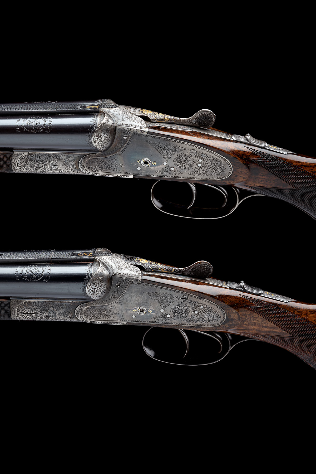 for 1910, 29 1/2in. nitro reproved barrels (repairs at breech) with radial-cut ribs engraved 'C. WERTGARNER IN ENNS', gold-inlaid with ornate '1' and '2' on stippled matt backgrounds at the breech ends, 2 3/4in. chambers, bored approx. 1/2 and full choke (No.1) and full choke in both (No.2), treble-grip actions with carved serpentine fences, toplevers gold-inlaid with an intertwined 'EA' monograms surmounted by a Herzogskrone, automatic safeties with gold-inlaid 'SICHER' details and '1' and '2', gold-inlaid cocking-indicators with arrow detailing, fine border and partial acanthus scroll engraving with floral bouquets, the makers name engraved within scrolling banners, retaining some original colour-hardening and finish, 14 1/4in. figured pistolgrip stocks, including buttplates, with cheekpieces, the heels inlaid with escutcheons engraved '11' and '12', weight 6lb. 9oz. (No.1) 6lb. 10oz. (No.2), in a brass-cornered oak and leather double guncase