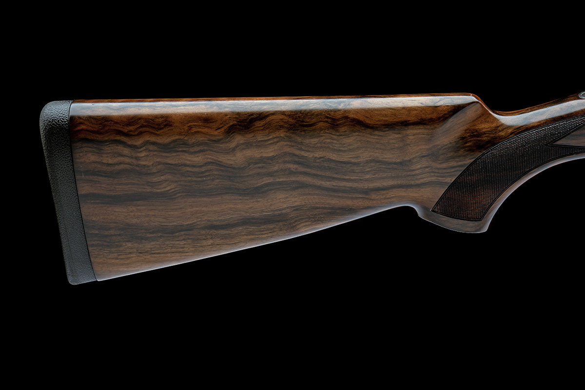 dated 2002, 28in. nitro barrels with 6mm ventilated matt top-rib, 3in. chambers, bored approx. imp. cyl. and 1/2 choke, hold-open toplever, automatic safety with integral barrel selector switch, gold-washed single trigger, engraved with foliate scroll, the decorative sideplates carved in relief with scenes of pheasant flushed from their naturalistic habitat and hound flushing partridge, silver finish, 14 3/4in. pistolgrip stock including 5/8in. rubber recoil pad, weight 7lb. 7oz.