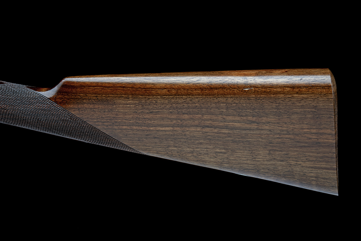for 1977, 27in. nitro chopperlump barrels, 2 3/4in. chambers, bored approx. imp. cyl. and 1/4 choke, engraved arcaded fences, removable striker discs, automatic safety, hand-detachable lockplates, gold-inlaid cocking-indicators, articulated front trigger, rolled-edge triggerguard, fully engraved with acanthus scrollwork, retaining much original colour-hardening and finish,14in. stock (together with 3/8in. original offcut), weight 6lb.