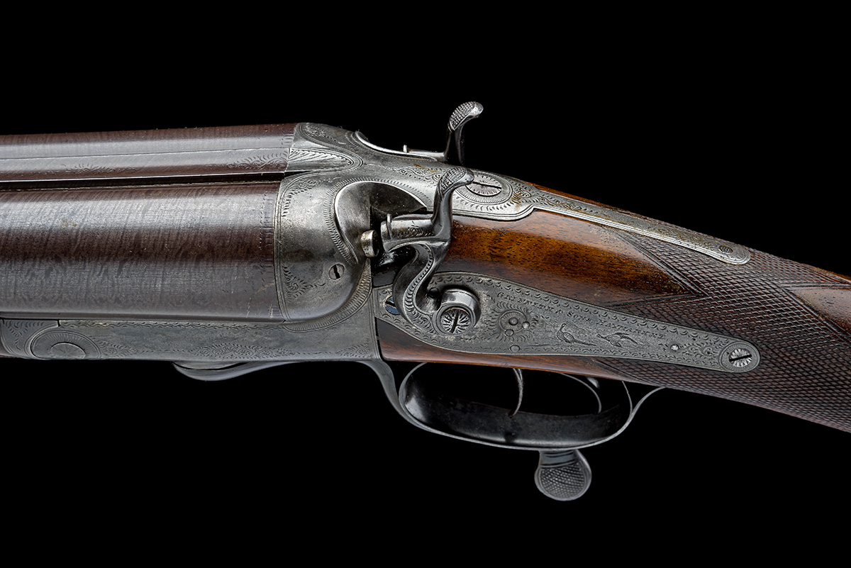 circa 1885, with rebrowned 32in. barrels, the top-rib marked 'BEST STEEL TWIST. RT. & LEFT CHOKE No. 1300', border and scroll engraved rounded action with Jones-style swing under-lever, border, scroll and gamescene engraved rebounding back-action locks signed 'GRIFFITH & SONS, HAYMARKET', well restocked in walnut with chequered wrist, later rubber heel-pad and chequered walnut snap-on fore-end, weight approx. 13lb.