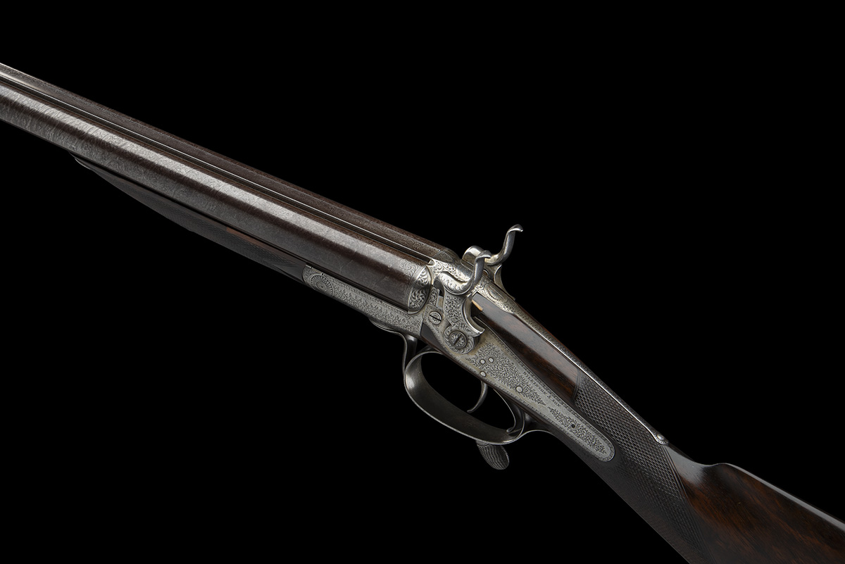 circa 1866, 30in. nitro reproved damascus barrels (in 2006), rib engraved 'WILKINSON & SON. GUN MAKERS TO HER MAJESTY. PALL MALL. LONDON.', the tubes with flashes of scroll engraving at the breech end, the rib engraved en suite and with a further shell motif, 2 3/4in. chambers, bored approx. true cyl. in both, action incorporating Charles Harvey patent retractable strikers, patent no. 1793 of 7th July 1866, use number 159, Jones patent rotary-underlever, non-rebounding sidelocks with carved hammers, white metal inlaid indicator lines, fine border and acanthus scroll engraving, the standing breech engraved 'WILKINSON'S No. 131 PATENT. 1866.', the triggerguard engraved with a nye of pheasant in their naturalistic habitat, brushed finish, 14in. figured stock with steel buttplate and escutcheon engraved with a leopards head and 'TRIA JUNCTA IN UNO', fore-end (insert repair to left edge) with grip catch release engraved 'Wilkinson's patent Lever Fore End', weight 6lb. 12oz., together with a fleece-lined canvas slip