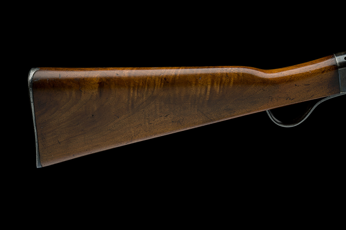 circa 1912, with blued slightly tapering 25 1/4in. barrel signed behind the ladder rear-sight 'MADE BY THE BIRMINGHAM SMALL ARMS CO. LTD., ENGLAND' and 'CARTRIDGE .300', dove-tailed fore-sight with shallow ramp, a Union of South Africa 'U' mark to nocksform, slab-sided receiver with the BSA trademark to the left side and take-down screw to the right, the back of wrist drilled for a peep-sight (absent, stock not inlet), walnut butt-stock with iron heel-plate, under-lever cocking and walnut splinter fore-end