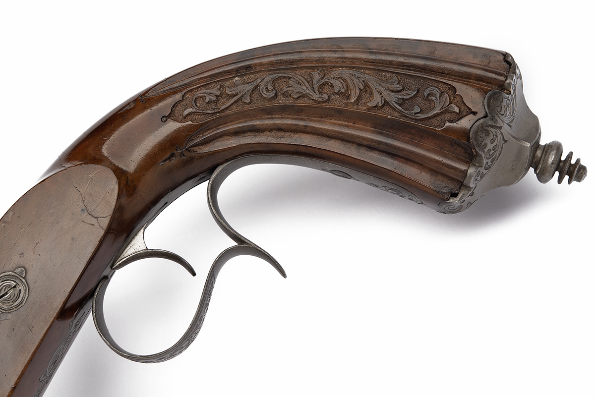 circa 1845, with blued octagonal 10in. rifled barrels, the top-flats marked in gilt 'ACIER', engraved breech-blocks 'in the white' marked '1' and '2' respectively, moulded nipple-bosses, dove-tailed blade fore-sights, adjustable notch rear-sights, borderline and scroll engraved hump-backed locks with dipped tails, en-suite hammers, walnut half-stocks relief-carved with raised floral scroll-work to the grips and fore-end tips, the grips also with longitudinal flutes, engraved and moulded butt-caps with central spires, spurred trigger guard bows, white metal oval barrel-key escutcheons, both pistols in fine order with much finish remaining and in a Le-Page Freres ebonised wood case lined and compartmented in the Continental manner in red velvet (some fading), retaining the lidded corner compartments with turned wood handles and a full suite of original accessories including a teak loading mallet and handled tools, powder flask, mould and loading rods, the exterior with central lock (no key)