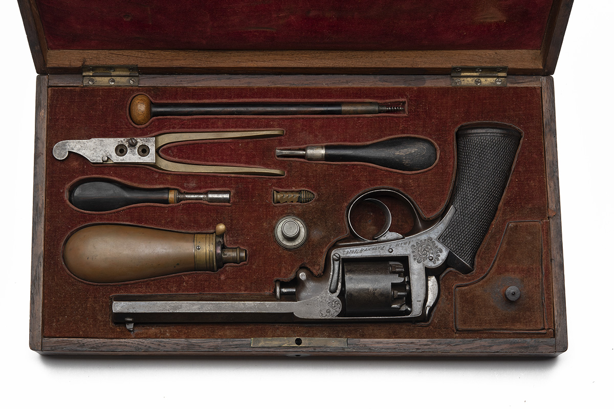 circa 1854 and being a licenced copy of the Adams, with octagonal 6 1/2in. barrel, dove-tailed fore-sight, standing notch rear-sight to the rear of the solid top-strap, borderline and scroll engraved frame, double action only mechanism with spur-less hammer, Kerr patent rammer and chequered walnut one-piece grip, in its continental market case lined and compartmented in the continental manner in red velvet (some fading and loose blocking) and complete with a full suite of accessories including mould, flask, loading rod, nipple-key, turn-screw and oil bottle
