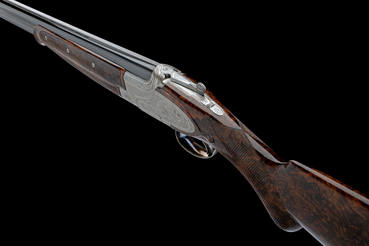dated 1964, 30in. nitro barrels with 6mm ventilated matt top-rib, 2 3/4in. chambers, bored approx. 1/4 and 3/4 choke, hold-open toplever engraved with a duck head in profile, adjustable trigger, beaded border and acanthus scroll engraving, the decorative sideplates with scenes of woodcock and pheasant in flight over their naturalistic habitat, the underside with the vignette of a bolting bunny, triggerplate signed 'R. Baptiste', silver finish, 15in. highly-figured semi-pistolgrip stock, weight 7lb. 11oz., together with a fleece-lined tan gunslip