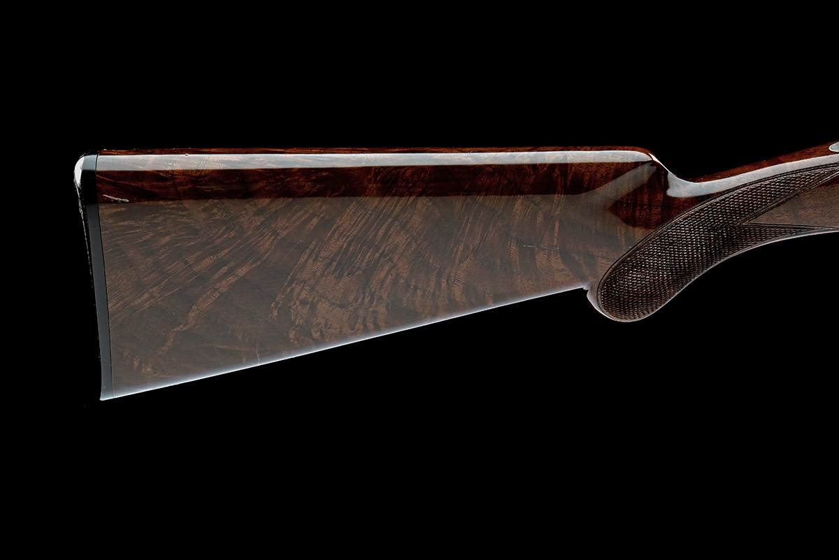for 1990, 28in. nitro reproved barrels (in 2024), with 6mm ventilated matt rib, 3in. chambers, multichoke (no spares), hold-open toplever, manual safety with integral barrel-selector switch, gold-washed trigger, the action and furniture engraved with bold acanthus scrollwork on a matt background, surrounding gold-inlaid game scenes of pheasant and duck, the underside with a setter, the triggerguard with a partridge, 14 1/4in. figured semi-pistolgrip stock including buttplate, weight 6lb. 14oz., in its makers faux-fur lined case