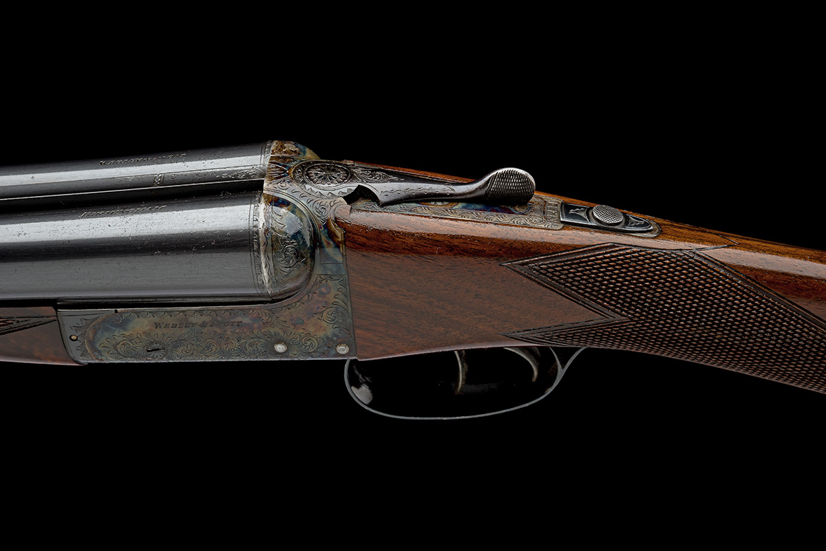 dated 1963, 28in. nitro barrels, tubes engraved 'WEBLEY & SCOTT. BIRMINGHAM.', 2 3/4in. chambers, bored approx. 1/4 and 3/4 choke, automatic safety, border and acanthus scroll engraving, retaining virtually full original colour-hardening and finish, 14 1/4in. stock including 1in. ventilated rubber recoil pad, weight 6lb. 9oz.