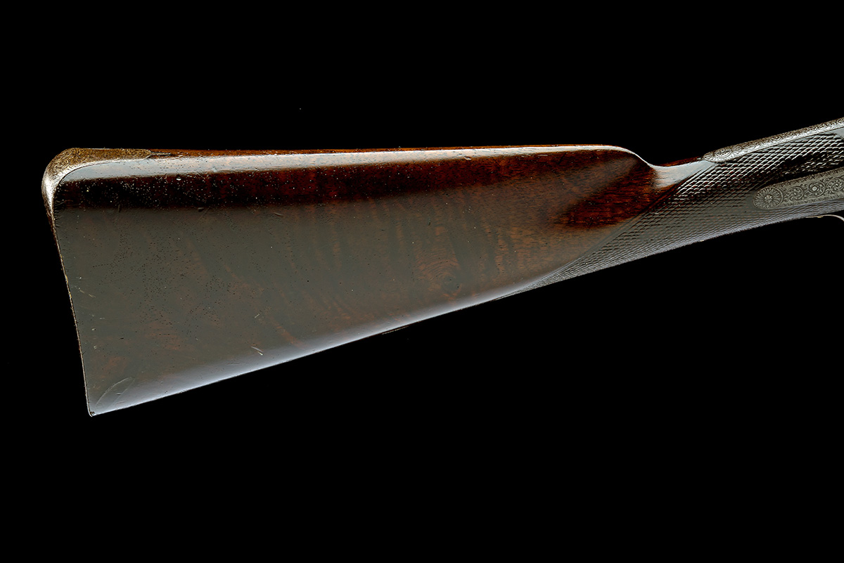 circa 1860, with twist-iron 30in. barrels signed on the top-rib 'J. BEATTIE, 205 REGENT STREET LONDON', border and scroll engraved long top-tang, border scroll and game-scene engraved back-action locks signed 'J. BEATTIE', engraved hammers with pierced noses for self extraction of the spent shells, chequered walnut butt-stock with iron heel-plate, engraved trigger guard bow and lower tang, integral rounded scroll engraved iron fore-end with hinged under-lever swinging back from the tip to draw forwards the barrels, the action table signed 'S. BREEDEN', finish lightly worn and stained
