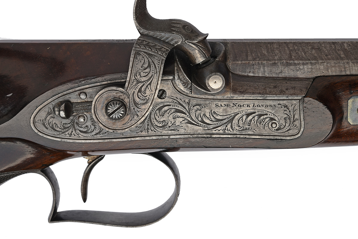 circa 1830, with octagonal 10in. smoothbore barrels signed 'S. NOCK LONDON' on the top-flats, colour hardened breech-blocks with engraved band, dove-tailed fore-sights, standing notch rear-sights to the front of the engraved top-tangs, borderline and acanthus scroll engraved colour hardened locks signed 'SAML. NOCK, LONDON', slab-sided dolphin-headed hammers engraved en-suite, bolted safes, walnut half-stocks with finely chequered saw-handle grips, flat based pommels inlet with engraved colour hardened heel-plates, blued and engraved iron furniture including square-backed trigger guards, single set triggers, white metal rectangular escutcheons to barrel keys, white metal fore-end tips and brass-tipped ebony ramrods, strong traces of finish remaining and in their maker's mahogany case lined and compartmented in green baize, original parchment trade-label inside lid and complete with a three-way flask, scissors ball mould, loading rod, oil bottle, cap-tin, bone nipple-pot and a cranked nipple-key