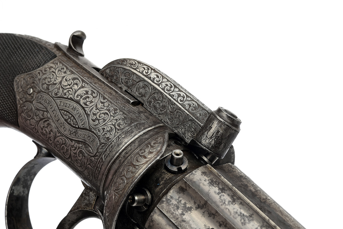 circa 1835, with London proved fully fluted 4in. colour hardened six-shot barrel group, each barrel numbered from '1' through '6' at breech, the flutes realistically carved in imitation of side-ribs, engraved securing screw at muzzle, fully scroll engraved nipple-guard with rolled edge, rounded border and scroll engraved bar-hammer action engraved in banners 'J. MANTON & SON' on the left and 'IMPROVED REVOLVING PISTOL' on the right, fully scroll engraved bar hammer with bevelled edges to the upper surface, integral barrel lock and safe position (safety plate to top-tang currently not engaging), guarded trigger and finely chequered walnut grip with iron trap at heel engraved with a crest of an eagle and snake, fair traces of colour remaining