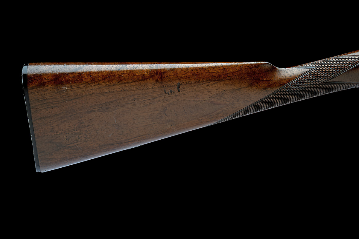 almost certainly converted from a pinfire gun of circa 1865, with fine damascus 30 7/8in. barrels of near 8-bore but with 10-bore chambers (Parson's own special design), the sunken top-rib signed 'WILLIAM PARSON, SWAFFHAM, NORFOLK', well engraved action body with finely engraved bar-action rebounding locks signed 'WILLIAM PARSON', engraved swing-action under-lever, chequered walnut straight-hand butt-stock with ribbed heel-plate, fully chequered snap-on splinter fore-end, much finish and strong traces of colour remaining