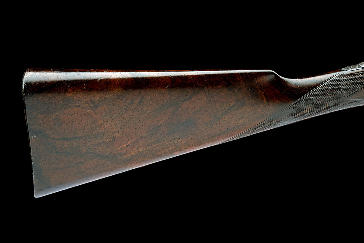 for 1894, 30in. nitro reproved barrels (in 1963), the rib engraved 'JOHN RIGBY & CO. 73 ST. JAMES'S STREET. LONDON. AND AT DUBLIN.', (faint) in gothic script, and 'WHITWORTH STEEL', 2 1/2in. chambers, bored approx. imp. cyl. and 1/4 choke, treble-grip action incorporating J. Rigby and T. Bissell patent rising third bite, patent No. 1141 of 1879, use number 577, action number 2333, carved leaf fences, slender toplever, automatic safety with gold-inlaid 'SAFE' detail, dipped-edge lockplates, best bold and acanthus scroll engraving, 13 1/2in. figured stock, fore-end with grip-catch release lever engraved 'RIGBY'S PATENT.', weight 6lb. 6oz., in its lightweight leather guncase