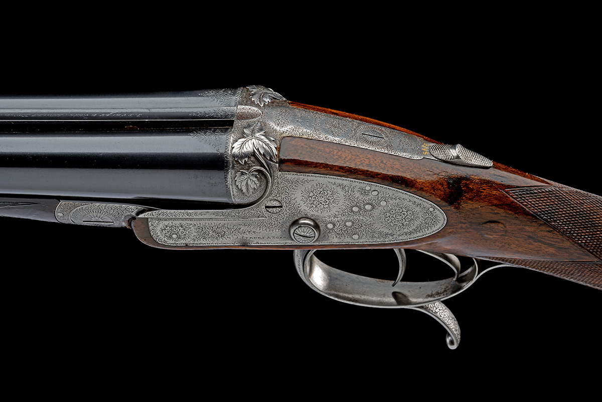 for 1879, 29in. Whitworth-steel nitro reproved barrels, the rib engraved 'J. PURDEY & SONS, AUDLEY HOUSE, SOUTH AUDLEY STREET, LONDON. MADE OF SIR JOSEPH WHITWORTH'S FLUID PRESSED STEEL' and with acanthus scroll detailing at the breech end, 2 1/2in. chambers, bored approx. true cyl. and 1/4 choke, action incorporating Daw underlever lever-cocking William Adams patent design, patent no. 1128 of 20th March 1879, the fences finely carved in high relief with leaf designs, broad top strap engraved 'PATENT', automatic safety with gold-inlaid 'SAFE' detail, large protruding tumbler pivots with cocking-indicators, conversion to ejector, best fine acanthus scroll engraving with floral bouquets, 14 1/4in. figured stock, some minor cracks and repairs to wood at knuckle and fore-end wood with damage from ejector mechanism, weight 5lb. 15oz.