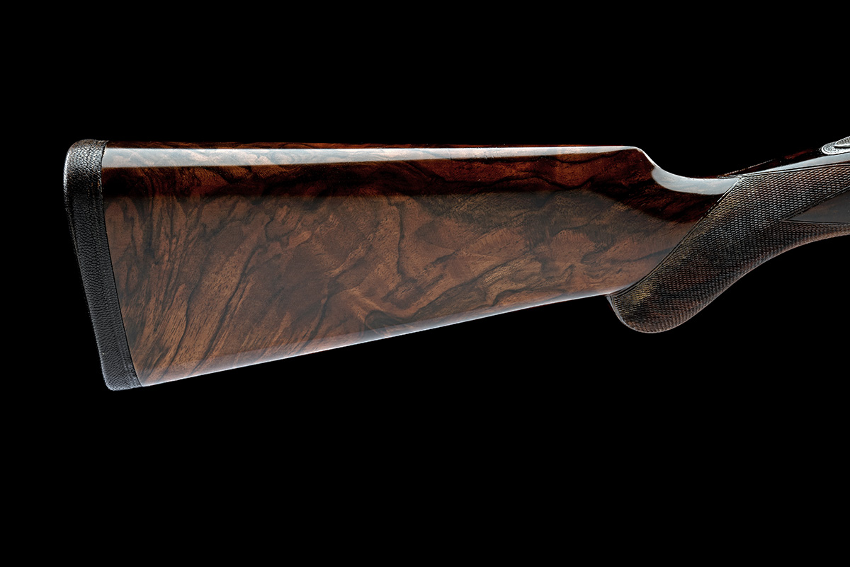 for 1997, 28in. nitro barrels with tapered ventilated matt top-rib, high visibility bead fore-sight, 3in. chambers, multichokes, hold-open toplever, automatic safety with integral barrel selector switch, the action, decorative sideplates and furniture engraved with floral and acanthus scroll engraving, the sideplates and underside with cartouches engraved with the make and model designation, the triggerplate signed 'Creative Art', bright finish, 14 3/8in. boldly-figured pistolgrip stock including 5/8in. leather covered recoil pad, weight 7lb. 10oz.