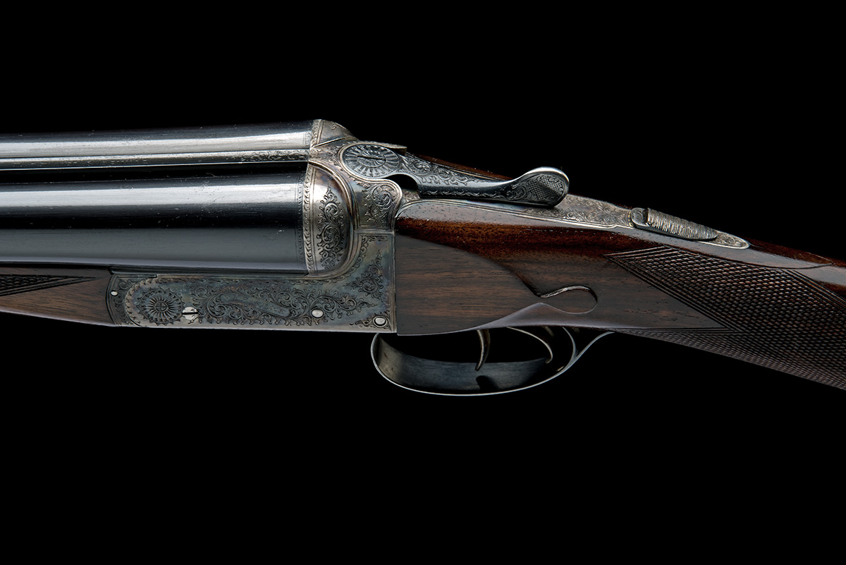 circa 1950, 28in. nitro barrels, rib engraved 'PARRACK SOLIHULL.', 2 1/2in. chambers, bored approx. imp. cyl. and 1/2 choke, automatic safety with gold-inlaid 'SAFE' detail, rolled-edge triggerguard, border and partial acanthus scroll engraving surrounding 'S.H. PARRACK' within a scrolled banner, retaining much original colour-hardening and finish, 15 1/4in. stock, weight 6lb. 13oz.
