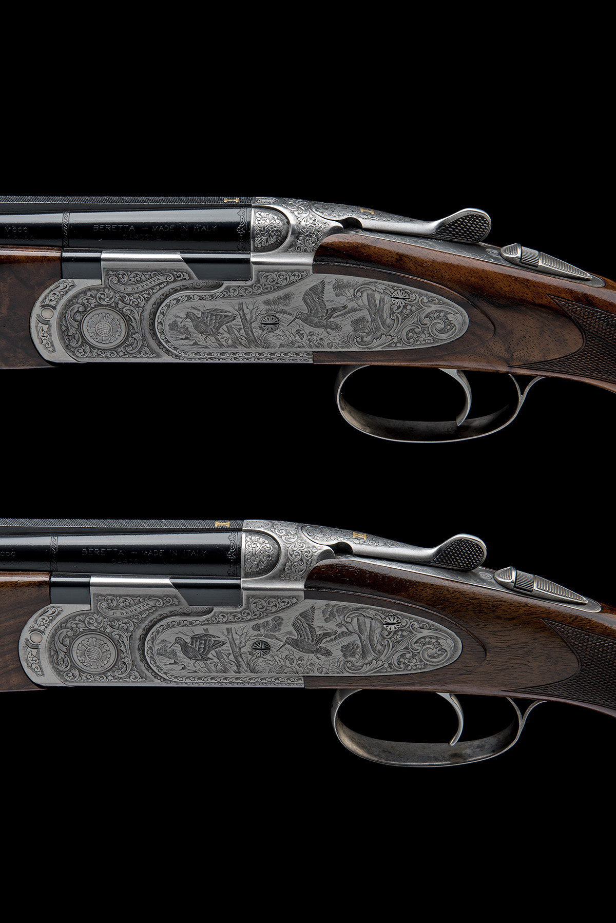 dated 2006, 29 1/2in. nitro barrels with 6mm ventilated matt top-ribs gold-inlaid 'I' and 'II', 3in. chambers, bored approx. imp. cyl. and 1/4 choke, hold-open toplevers gold-inlaid 'I' and 'II', automatic safeties with integral barrel selector switches, acanthus scroll engraving, decorative sideplates with scenes of woodcock and partridge, silver finish, 14 1/4in. figured semi-pistolgrip stocks including 1/4in. wooden buttplates, weight 6lb. (No.I) 6lb. 5oz. (No.II), in a leather double motorcase