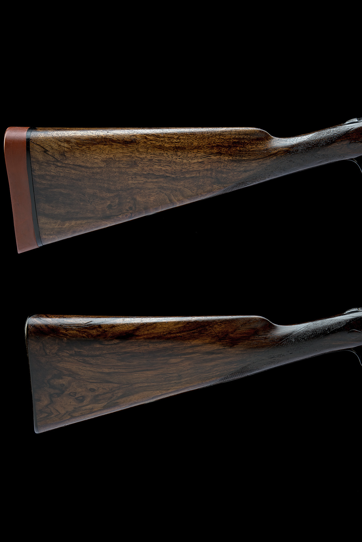 for 1904, 29in. nitro replacement barrels (circa 1958, barrel numbers 15265 / 15270), ribs engraved 'WILLIAM POWELL & SON. 35. CARR'S LANE. BIRMINGHAM.' and gold-inlaid '1' and '2' at the breech ends, 2 1/2in. chambers, bored approx. imp. cyl. and 1/4 choke (No.1) and 1/4 and 3/4 choke (No.2), treble-grip actions, toplevers gold-inlaid '1' and '2', automatic safeties with gold-inlaid 'SAFE' details, fine acanthus scroll engraving with floral bouquets, 15 1/2in. stock including 1in. recoil pad (No.1) and 14 3/4in. stock (No.2), weight 7lb. (No.1) and 6lb. 11oz. (No.2), with their original brass-cornered leather case (No.1 gun no longer fitting due to recoil pad)