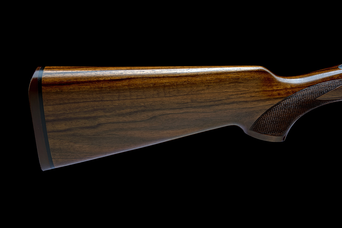 dated 1988, 29 1/2in. nitro barrels with 8mm ventilated matt top-rib, 2 3/4in. chambers, multichokes (with spares), hold-open toplever, manual safety with integral barrel selector switch, gold-washed single trigger, partial acanthus scroll engraving surrounding game scenes, silver finish, 14 1/2in. pistolgrip stock including 1/2in. rubber recoil pad, weight 6lb. 3oz.