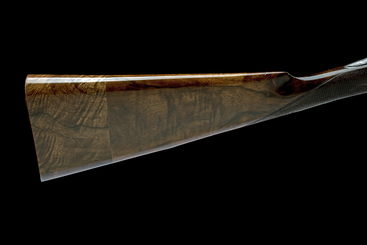 for 1931, 26in. nitro reproved barrels (in 2025), the rib engraved 'JOHN WILKES. 79 BEAK STREET. REGENT STREET. LONDON. W.', and with acanthus scroll detailing at the breech end, 2 1/2in. chambers, bored approx. true cyl. and 1/4 choke, automatic safety with inlaid 'SAFE' detail, border and acanthus scroll engraving, the makers name in a scrolling banner, retaining slight traces of original colour-hardening and finish, 15 7/8in. figured stock (knot split just forward of the comb), including 3 1/8in. wooden extension, weight 5lb. 3oz., together with a vintage leather slip