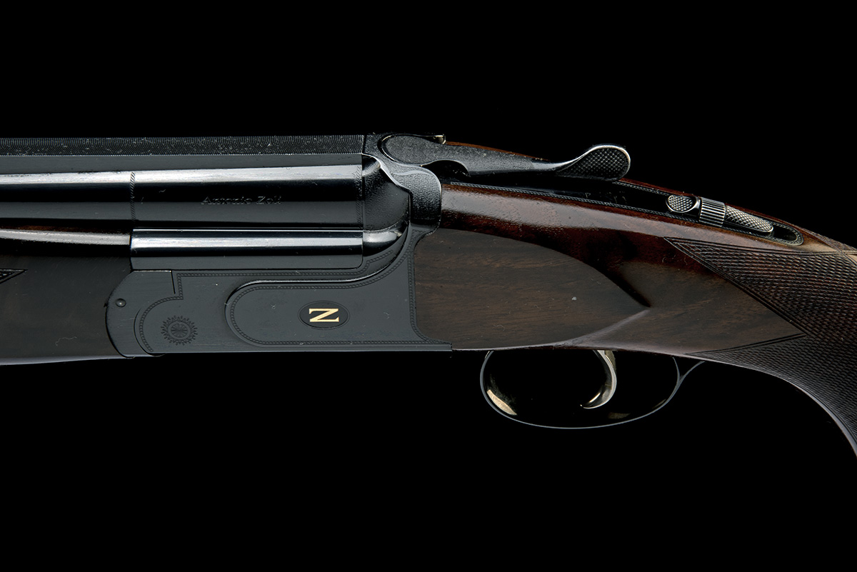 for 2014, 29 1/2in. nitro reproved barrels (in 2025) with ventilated tapered matt top-rib, 3in. chambers, multichokes (with spares), hold-open toplever, manual safety with integral barrel selector, adjustable trigger, black finish with beaded border engraving and central gold-inlaid 'Z' motifs, 14 1/2in. pistolgrip stock including 3/4in. recoil pad, weight 8lb. 3oz., in its universal case