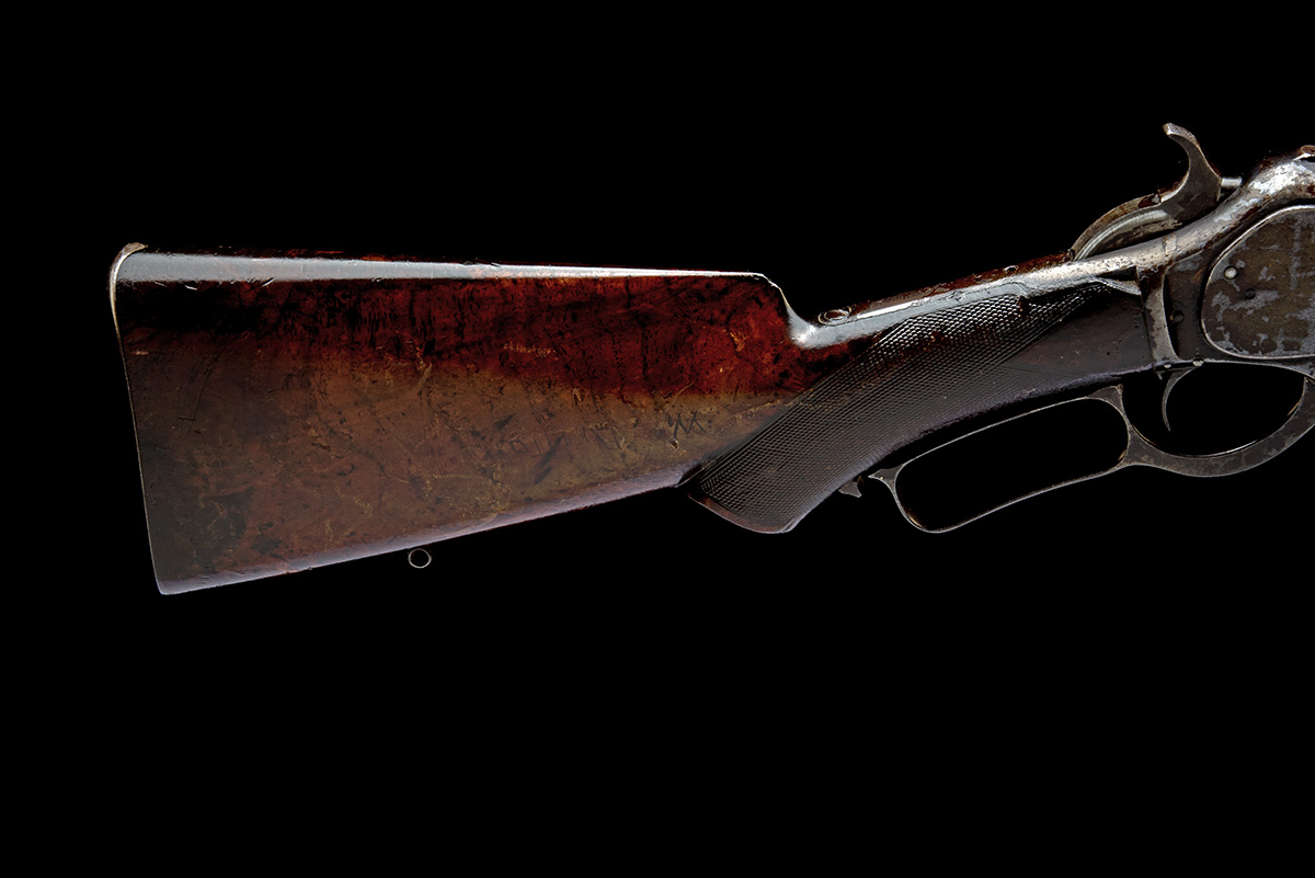 for 1884, with octagonal 28in. barrel, the top-flat marked 'WINCHESTER'S REPEATING ARMS NEW HAVEN CONN USA' over 'KING'S IMPROVEMENT PATENTED MARCH 29 1866 OCTOBER 16 1860', folding ring fore-sight with bead and blade, 'Africa' rear-sight of folding ladder with six further graduated flush folding blades, each with platinum centre-line, calibre designation and addition South African registration number (WR18606) to left side of breech, blued receiver with period London proofs, automatically retracted sliding dust-cover operating on an integral rail, colour hardened central hammer, model designation to top-tang (blanking plug for an auxiliary peep-sight absent), chequered walnut pistol-grip butt-stock of approximately 3X grade, smooth iron shotgun heel-plate, horn inlay to grip, single set trigger (set currently not functioning), chequered walnut fore-end of similar grade to butt, full-length magazine tube and eyelets for the Winchester Sling (sling absent), strong traces of finish and colour