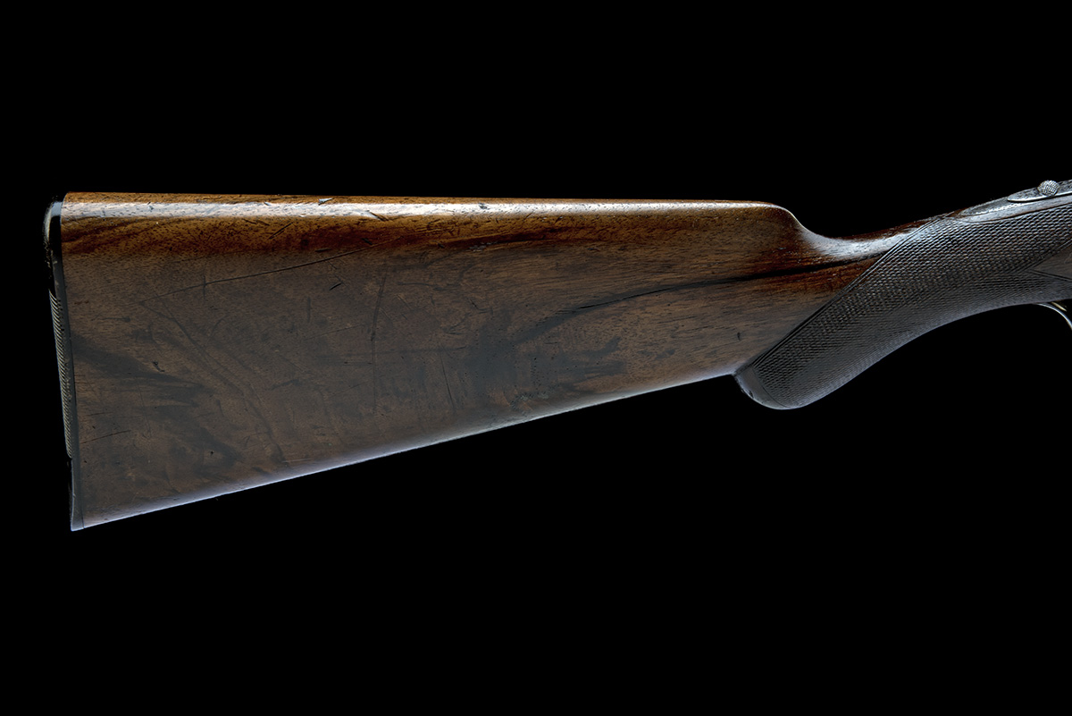 for 1940, 26in. nitro barrels, finely wave cut rib with replacement small bead fore-sight (original button foresight with the Lot), the tubes engraved 'AUGUSTE FRANCOTTE BREVETE A LIEGE', 2 3/4in. chambers, bored approx. true cyl. and 1/4 choke, treble-grip action with side-clips, automatic safety, action and decorative sideplates with fine acanthus scroll and floral engraving, the triggerplate signed 'GRAVEUR L. SMEETS', likely replacement floorplate screw, retaining traces of colour-hardening and finish, 14 1/2in. semi-pistolgrip stock including horn buttplate, weight 5lb. 11oz.