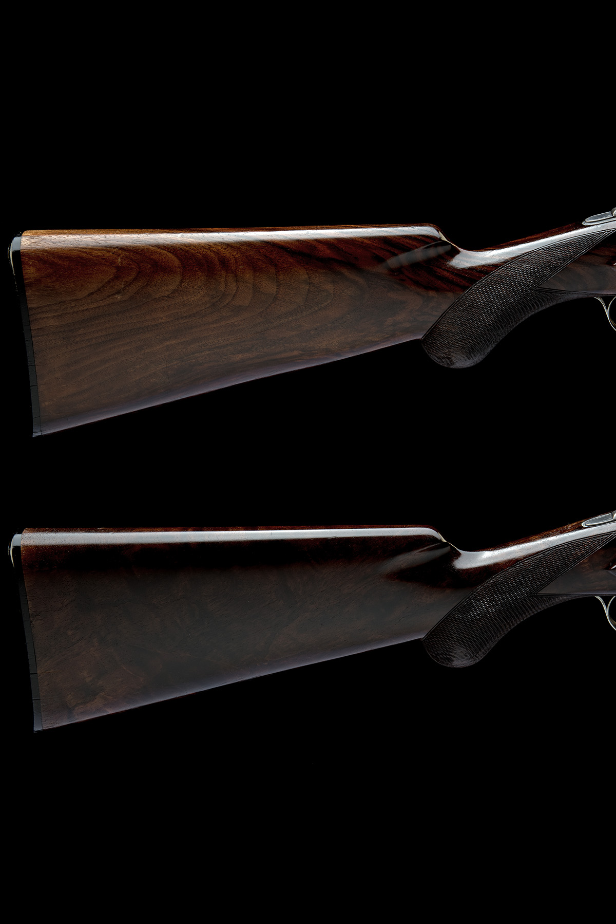 for 2000, 27 5/8in. nitro barrels, 6mm ventilated matt top-ribs gold-inlaid 'I' and 'II', 2 3/4in. chambers, bored approx. 1/4 and 1/2 choke, hold-open toplevers gold-inlaid 'I' and 'II', automatic safeties with integral barrel selector switches and gold-inlaid 'O', 'U' and 'S' details, bold acanthus scroll engraving with game scenes of pheasant and duck, No. I signed 'F. KRILL', No. II signed 'J.M. MARTENS', 14 3/8in. figured pistolgrip stocks including buttplates, No. I cracked at hand, weight 7lb. 2oz. (No. I) and 7lb. 6oz. (No.II), in their individual cases