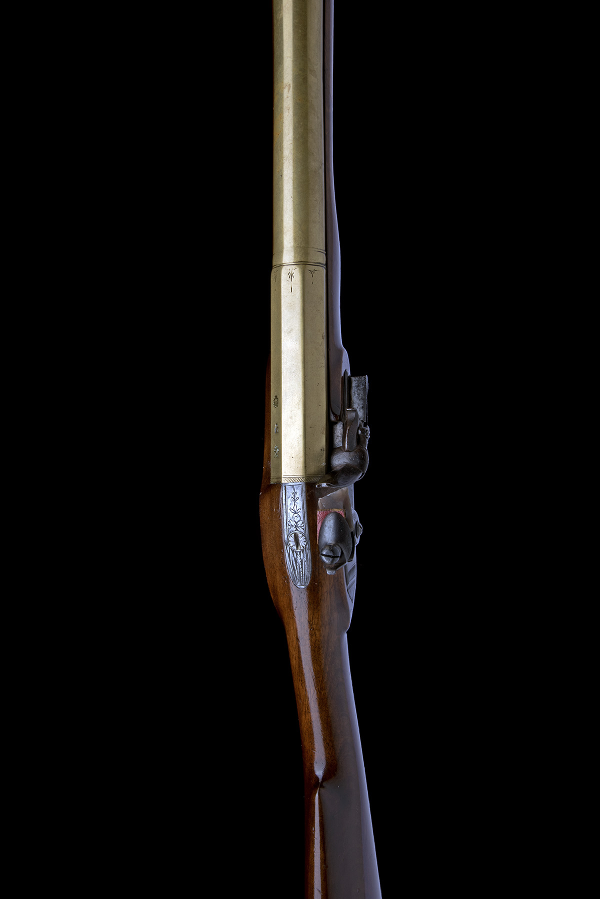 circa 1815, with Birmingham proved two-stage 14in. barrel with banded offset muzzle, moulded band at the intersection, engraved iron top-tang, borderline engraved lock signed 'TARVER', swan necked cock, walnut full-stock of shotgun style, brass furniture and wood ramrod