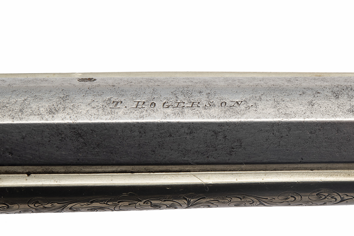 circa 1835, with octagonal 6 1/2in. Birmingham proved barrels signed 'T. ROGERSON', scroll engraved breech-blocks with integral tangs, diminutive curved back-action locks with borderline and scroll engraving, engraved dolphin headed hammers, scroll engraved paktong three-quarter stocks with flared flat-heeled grips fitted with central traps, long saw-handled spurs, applied guards with finger-spurs and captive iron under-barrel ramrods