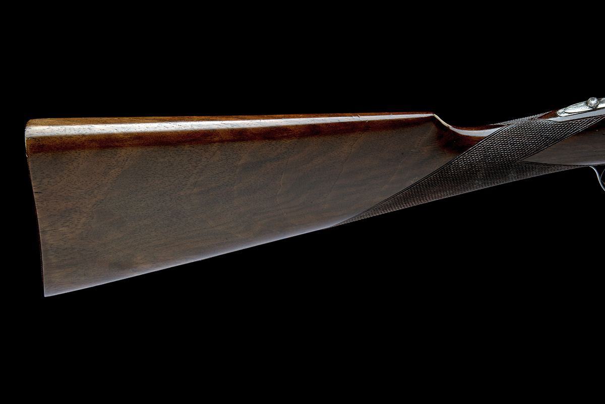 for 2001, 30in. nitro chopperlump barrels, 2 3/4in. chambers, bored approx. 1/4 and 1/2 choke, engraved arcaded fences, removable striker discs, automatic safety, gold-inlaid striker discs, articulated front trigger, rolled-edge triggerguard, acanthus scroll engraving, retaining some original colour-hardening and finish, 14 7/8in. stock, weight 6lb. 12oz.