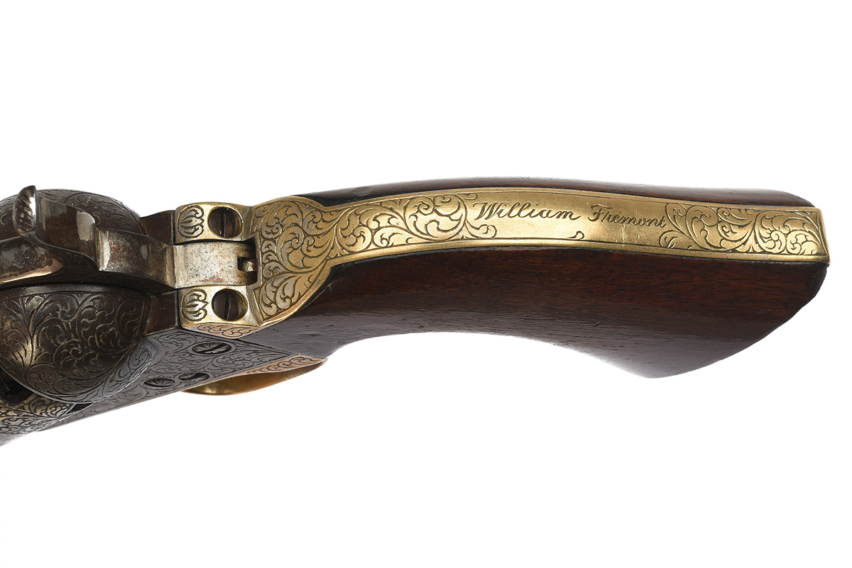 for 1854, the engraving added late 19th century, with octagonal 7 1/2in. barrel signed 'ADDRESS SAML. COLT NEW-YORK CITY', the barrel flats except the underside and address area engraved with coarse scrollwork, open iron frame engraved in a similar manner and marked 'COLTS PATENT', plain six-shot cylinder re-engraved with a scene of buffalo around the front with similar scrollwork to the rear, engraved hammer-sides, engraved brass trigger guard and grip-straps, the back-strap further engraved 'WILLIAM FREMONT', smooth flared walnut grip and engraved under-barrel rammer, all matching numbers (wedge possibly a replacement)