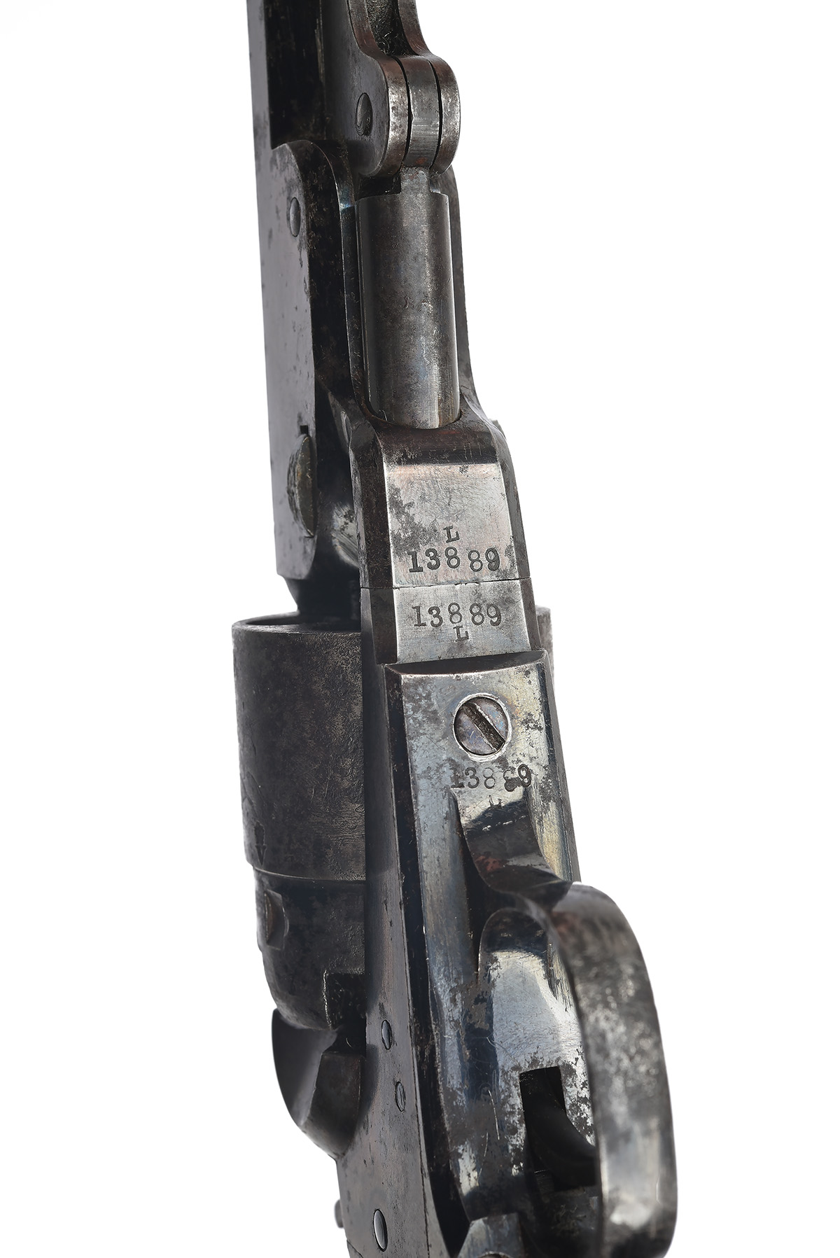 for 1862, with blued octagonal 6 1/2in. barrel signed on the top-flat 'ADDRESS COL SAML. COLT NEW-YORK U.S. AMERICA', and stamped with the colt stallion trademark below the letter 'C' on the left side above and forwards of wedge, London proofs, stepped cylinder with roll engraved stagecoach scene (some shallow pitting), colour hardened open iron frame marked 'COLTS PATENT', blued dome-headed screws, blued iron grip-straps and trigger guard, smooth flared walnut grip, all matching numbers, each marked with a letter 'L' above or below, strong amount of original finish remaining