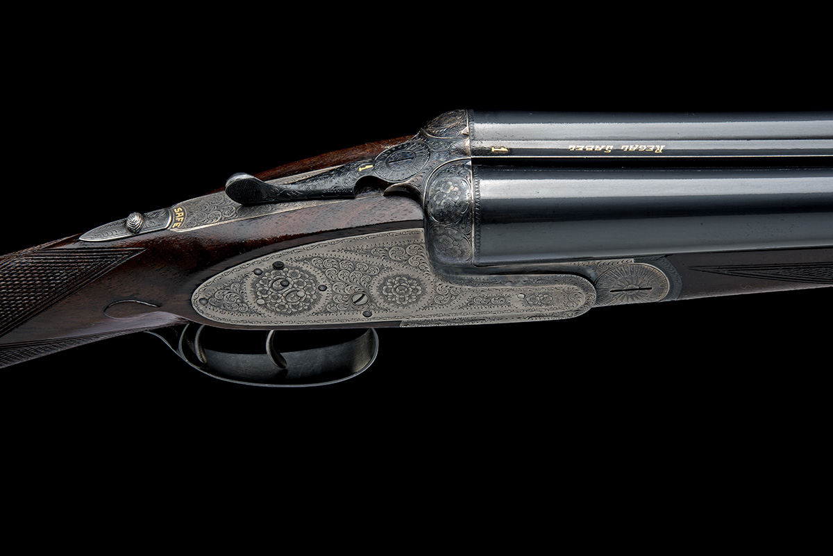for 1976, 26 5/8in. nitro chopperlump barrels, rib inlaid in gold 'REGAL SABEL' and '1', 2 3/4in. chambers, bored approx. true cyl. and 1/2 choke, Holland & Holland style self-opening system, toplever gold-inlaid '1', automatic safety with gold-inlaid 'SAFE' detail, removable striker discs, hand-detachable lockplates, gold-inlaid cocking-indicators, articulated front trigger, rolled-edge triggerguard, acanthus scroll engraving with floral bouquets, retaining traces of original colour-hardening, 14 5/8in. stock, weight 6lb. 8oz.