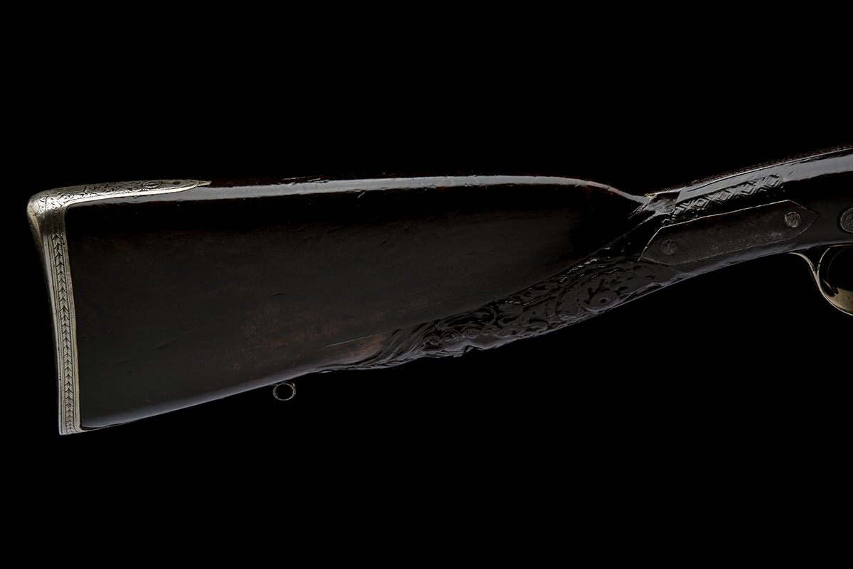 possibly an Irish registration mark, the rifle circa 1835, with fine damascus octagonal profile 29 1/2in. barrel, the raised top-rib signed in gilt script 'MANTON, LONDON', small bead fore-sight, shallow standing notch rear-sight, moulded shallow fenced snails and gold line at breech, Belgian proofs, border and acanthus scroll engraved long top-tang extending to front of comb, border and acanthus scroll engraved bar-action hump-backed locks, en-suite hammers, the noses chisel-carved and moulded in the form of mythical beasts, skip-chequered walnut half-stock cracked through behind locks and plated at hand (chequering rubbed smooth), the wrist carved with the mask of a green man, cast and engraved white metal furniture including hinged heel-plate concealing apertures for two charges and white metal tipped ramrod