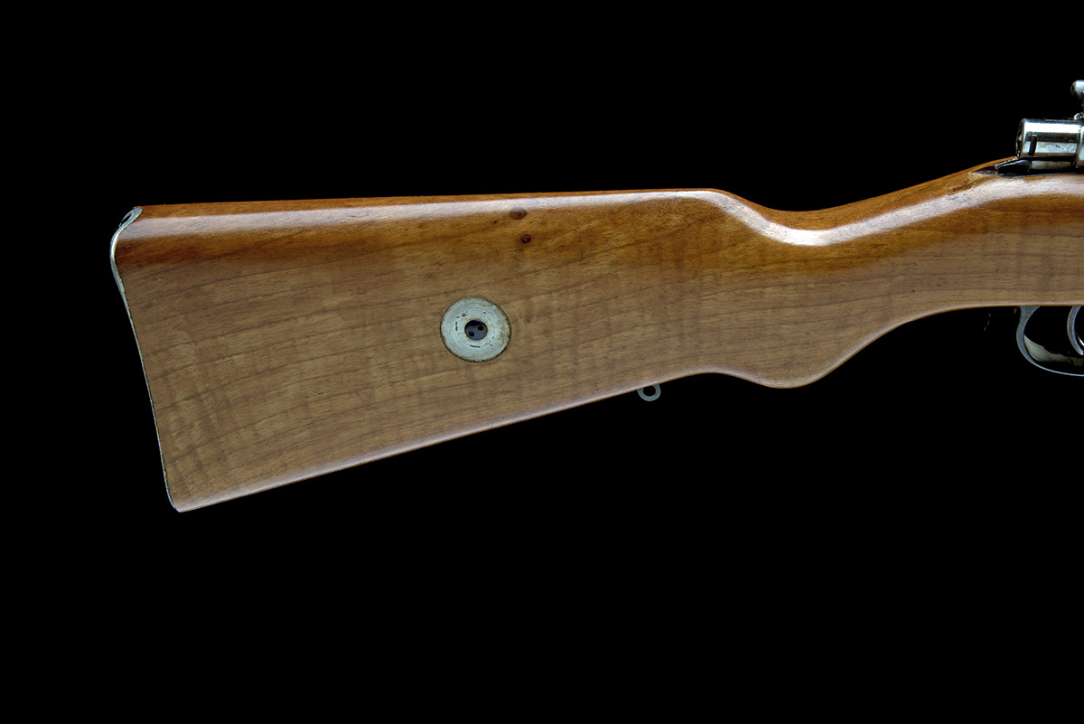 circa 1935, 29 3/4in. nitro barrel, block and blade fore-sight, adjustable tangent rear sight, receiver with thumb cut-out and marked 'MAUSER-WERKE A.G. OBERNDORF A/N.', on the left hand side, the receiver ring marked with the Brazilian crest, and 'MOD. 1935.', the action bridge with the Mauser logo, straight bolt handle, hinged floorplate with military-style release catch, retaining virtually full original blued finish, three-quarter length semi-pistolgrip stock, 13in. pull, cleaning rod, sling eyes, all matching numbers with matching bayonet and detachable muzzle thread cap, weight 9lb. 6oz.