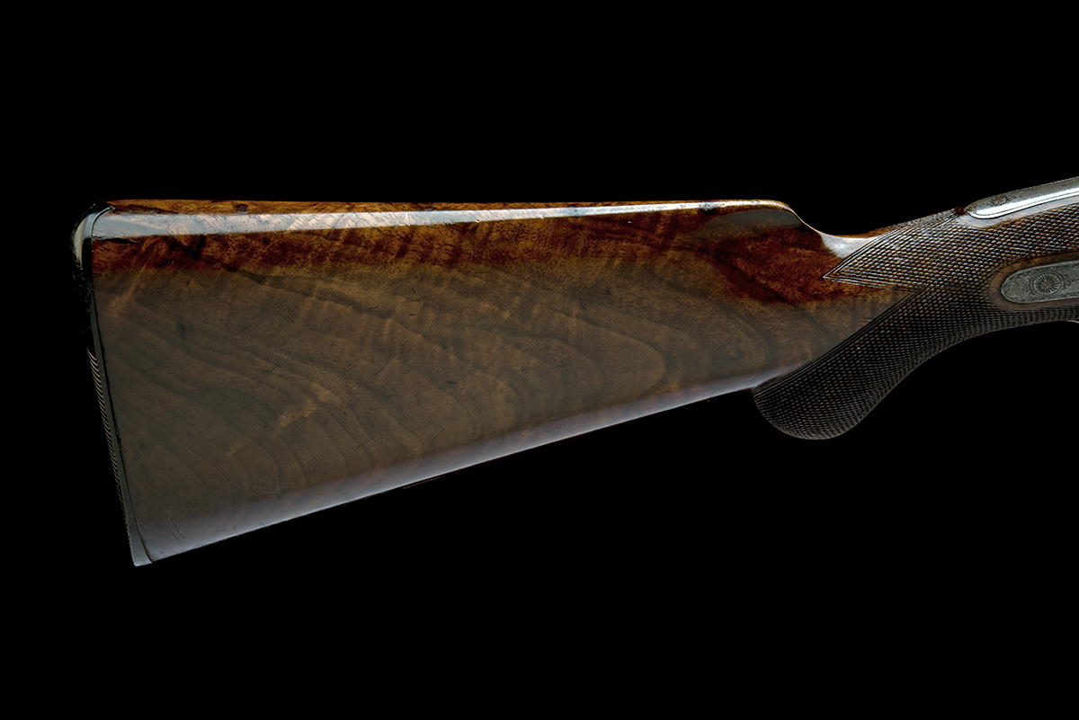 for 1893, with damascus 32in. barrels, the machine engraved top-rib signed in a rectangular panel 'W.R. PAPE NEWCASTLE-ON-TYNE. INVENTOR OF CHOKE BORING', bead fore-sight, colour hardened rounded swing-under-lever receiver with bored engraving and shallow moulded fences, border engraved colour hardened back-action locks signed centrally 'W.R. PAPE', figured chequered walnut semi pistol-grip butt-stock, ribbed horn heel-plate and chequered walnut splinter fore-end with pull-down catch release and horn tip insert